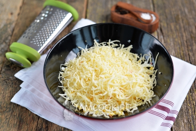 Любимый твердый сыр лучше натереть на мелкой терке, добавляем его к яйцам.