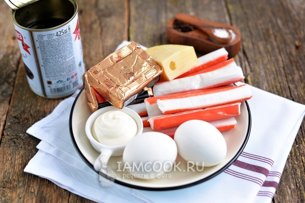Продукты для приготовления закуски «Рафаэлло» из крабовых палочек подготовим по списку. Крабовые палочки должны быть из морозильной камеры, а плавленый сырок - из холодильника. Яйца ставим вариться ровно на 10 минут, охлаждаем в ледяной воде, чистим.