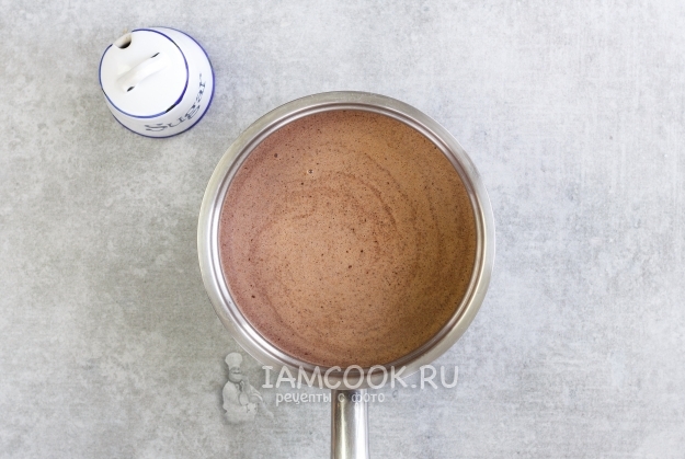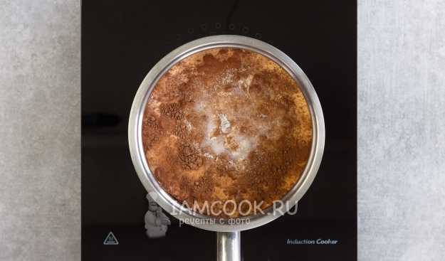 В небольшой кастрюле или сотейнике соедините молоко, сливки, ванильный сахар и порошок какао.