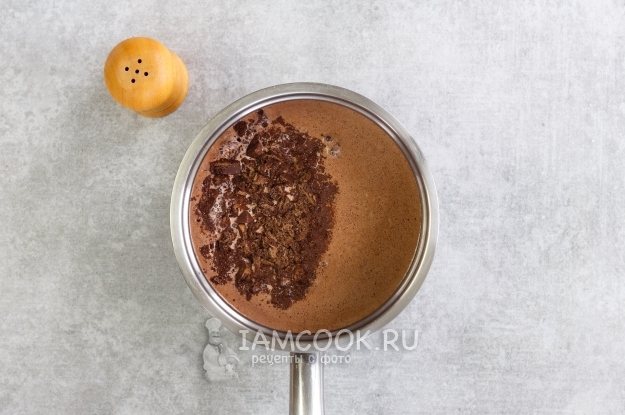 В молочную смесь добавьте измельченный шоколад и щепотку соли. Перемешайте все до полного растворения кусочков шоколада.
