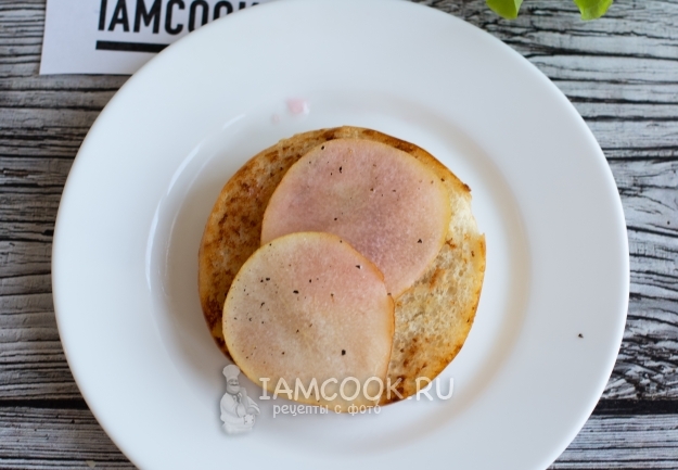Все продукты готовы. Можно собирать бургер. На булочку положите один-два кусочка груши.