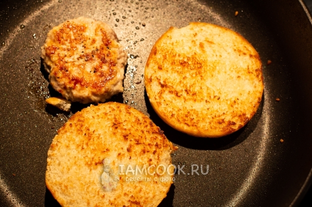 Пока обжаривается котлета, разрежьте булочку пополам. Когда котлету перевернёте, на ту же сковороду положите каждую половинку булки. Обжарьте их с каждой стороны примерно секунд по 30-40. До характерного золотистого цвета. Хлеб впитает все масло и жир от мяса. Будет хрустящий и пропитанный мясом. Очень вкусный!