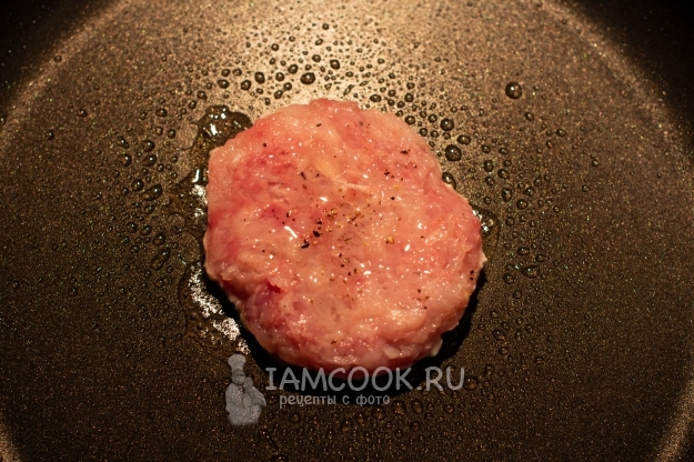 Фарш посолите, поперчите. Слепите плоскую котлету. По диаметру она не должна быть больше булочки. Сделайте примерно такую же. При жарке она все равно чуть уменьшится. Толщина - около одного сантиметра. Ну это уже по вашему вкусу. Кому-то нравятся тоненькие котлеты в бургерах, кто-то любит толстые.