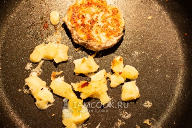 Как только он расплавится, положите на сыр котлету. Через пару секунд переверните и еще чуть-чуть обжарьте на сыре. Сыр прилипнет к котлете и она станет сырной!