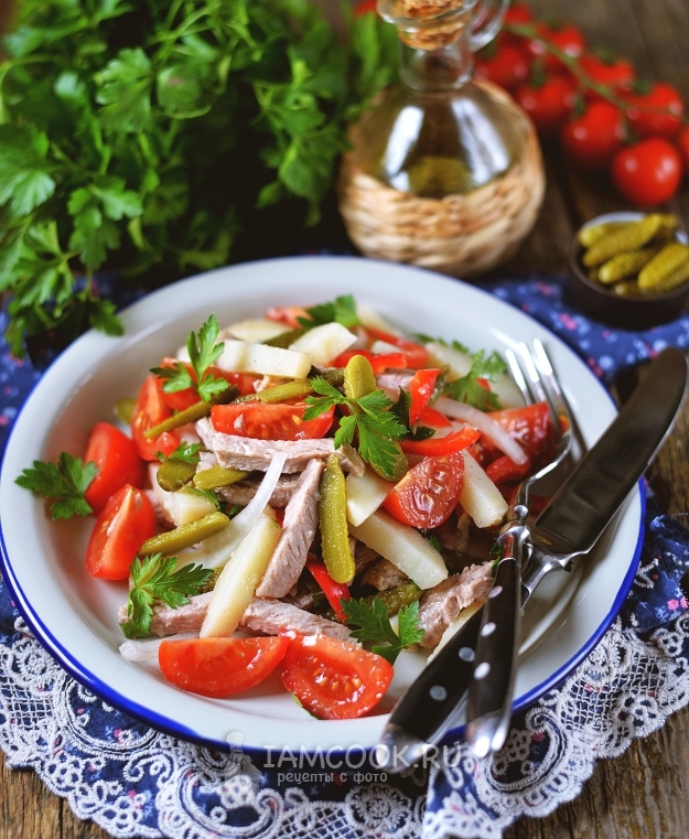 Разложите готовый салат с корнишонами и мясом по порциям и подавайте сразу же после приготовления.