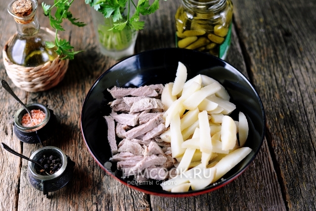 Срежьте с готовой свинины сальные прослойки, если есть. Картофель почистите. Нарежьте их соломкой, сложите в глубокую миску.
