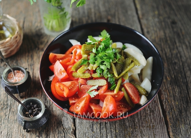 Дальше нужно нарезать огурчики корнишоны вдоль на две половинки, нарубить зелень, заправить салат солью, перцем и вкусным постным маслом, которое больше любите. Хорошенько все перемешайте.