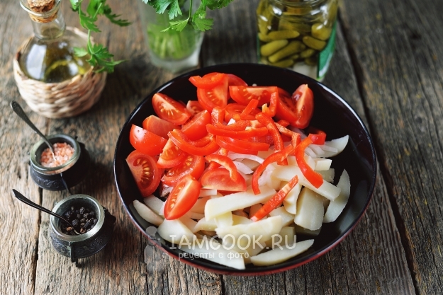 Болгарский перец очистите от семечек, нарежьте соломкой, помидоры черри нарежьте на четвертинки, белый лук - полукольцами. Добавьте все это к свинине с картофелем.