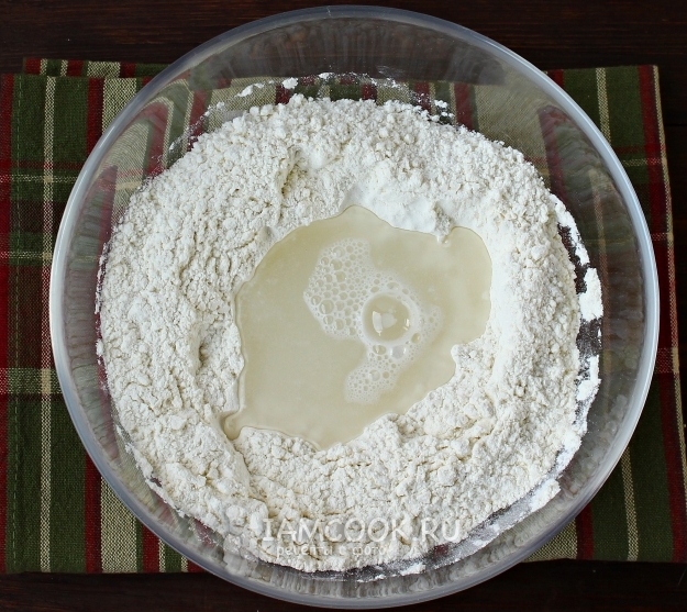 Вливаем воду, замешиваем тесто, постепенно подсыпая оставшуюся муку. Муки может уйти меньше или больше, чем заявлено в рецепте.