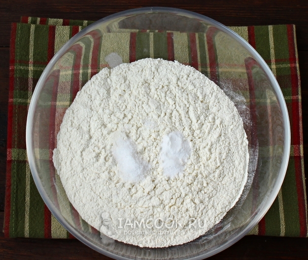 Большую часть муки высыпаем в миску. Всыпаем соль, соду и лимонную кислоту, хорошо размешиваем.