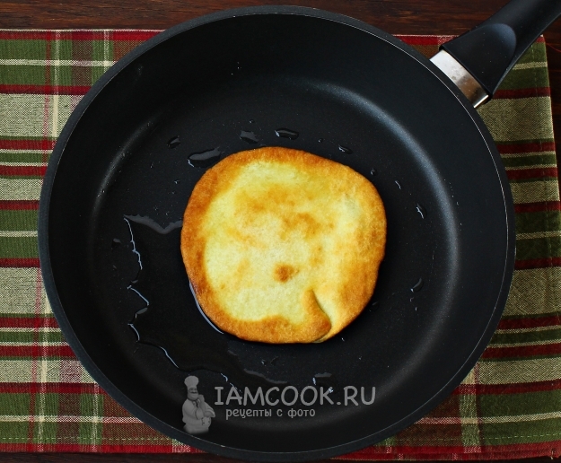 Выкладываем одну или несколько заготовок на разогретую с небольшим количеством масла сковороду. Огонь убавляем до среднего, сковороду накрываем крышкой, обжариваем лепешки с обеих сторон до приятного зарумянивания.