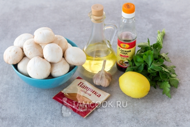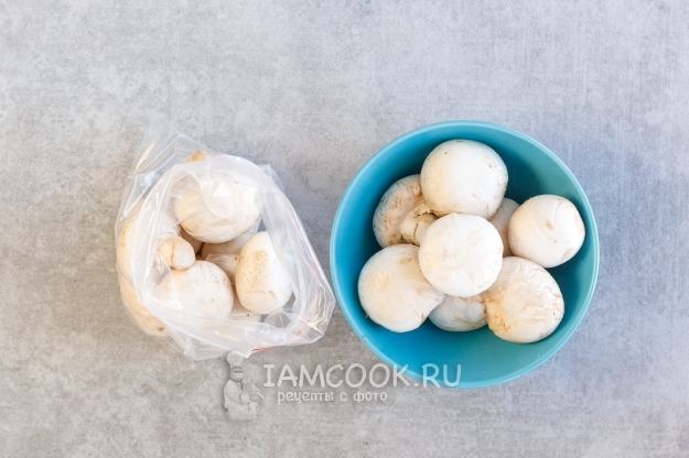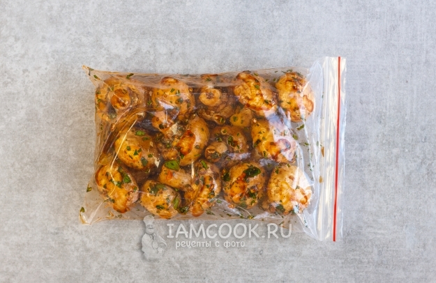 Вымойте, обсушите шампиньоны и уложите в герметичный пакет или емкость для маринования. На мой взгляд, удобней мариновать грибы в пакете – маринад лучше распределяется, легче перемешивать.