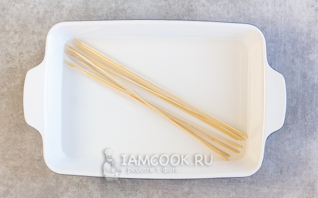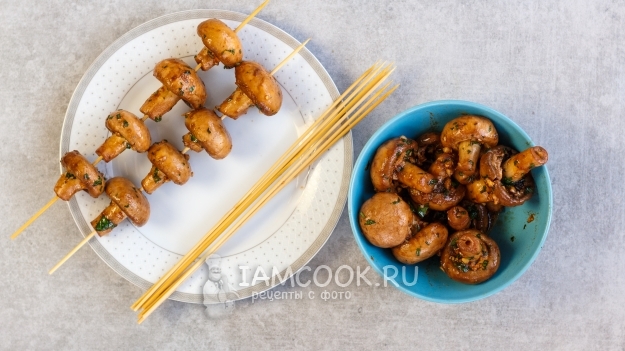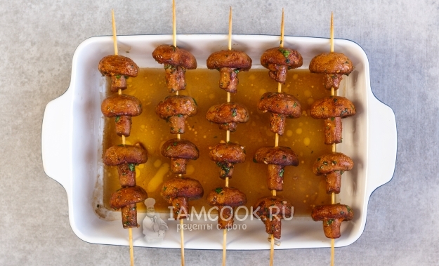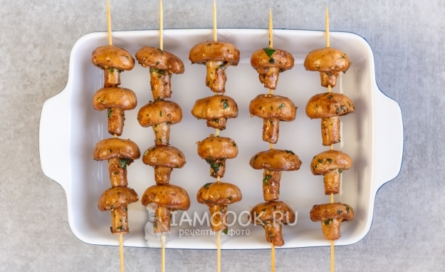 Пока маринуются шампиньоны, подготовьте шампуры или замочите в холодной воде деревянные шпажки, для запекания грибов.