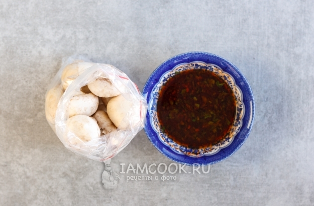 Тщательно все перемешайте, для того чтобы маринад равномерно распределился, и оставьте шампиньоны минимум на 1 час для маринования. Если нужно, чтобы грибы быстрее пропитались маринадом, оставьте их при комнатной температуре и периодически встряхивайте и перемешивайте шампиньоны в пакете, пока они настаиваются. Если маринуете шампиньоны заранее - храните их в холодильнике.