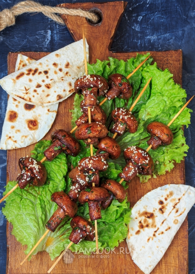 Готовность шампиньонов можно определить, слегка наклонив шампур или шпажку. Как только грибы начнут свободно скользить и скатываться по шампуру – готово, можно подавать блюдо к столу.