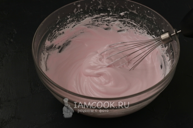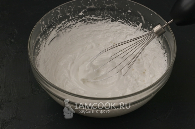 Для белкового крема поместить в миску охлаждённые белки, добавить сахар, ванильный сахар и лимонную кислоту. Взбить венчиком около 3 минут. Затем массу поставить на паровую баню и продолжать взбивать крем на максимальной скорости около 10 минут, крем должен хорошо загустеть. Далее миску с кремом убрать с паровой бани и взбивать ещё несколько минут, пока крем не начнёт накручиваться на венчик.
