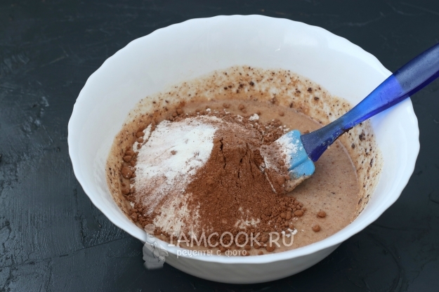 Просеять в тесто муку с разрыхлителем, добавить какао.