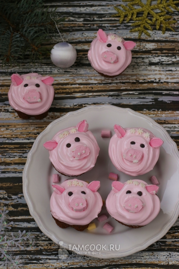 Год Свиньи для меня - особенный, так как это год рождения моего мужа. Ещё несколько месяцев назад я составила список всех свиноподобных блюд, которые хотела приготовить, и только сейчас их понемногу реализовываю. Хочу предложить вам замечательные шоколадные капкейки, которые можно украсить в виде мордочек симпатичных хрюшек, используя белковый крем, маршмеллоу, шоколадные капли и кондитерскую посыпку.