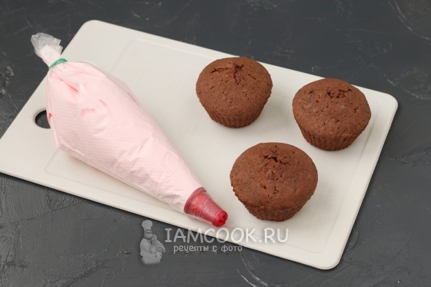 Наполнить кремом кондитерский мешок. Насадка - большая звёздочка. Украсить верх капкейков кремом.