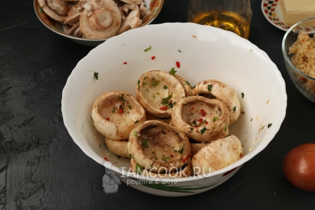 Этой смесью натереть шляпки шампиньонов и оставить на 20-30 минут.