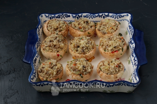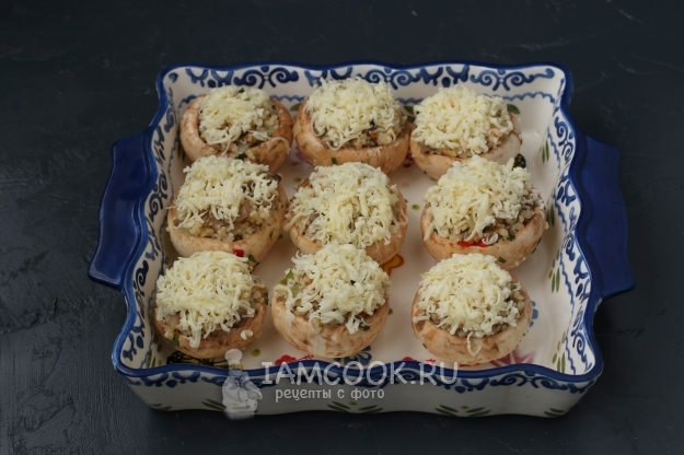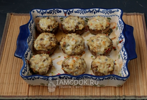Духовку разогреть до 180 градусов, поставить в неё фаршированные шампиньоны и запекать 30 минут.