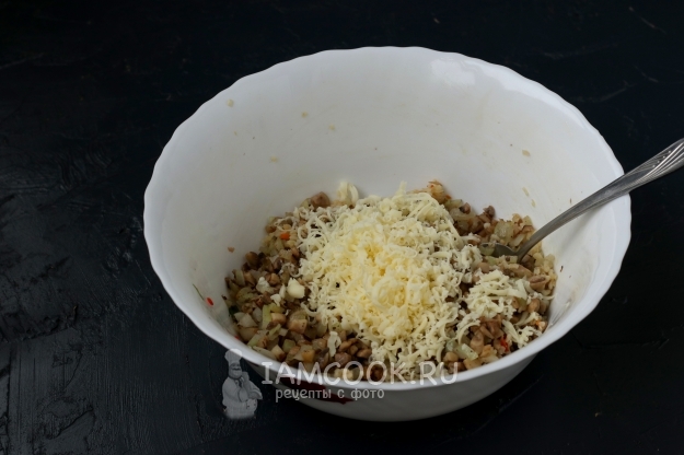 Для начинки измельчить обрезанные части грибов и мелко нарезать лук. Обрезков получается достаточно много, можно взять только половину, а остальное использовать для другого блюда. На растительном масле обжарить грибы до выпаривания влаги, добавить лук и обжарить до прозрачности, в конце посолить. Из миски грибы переложить в форму для запекания, а в миску поместить варёный булгур, добавить обжаренные грибы с луком, а также половину натёртого сыра.
