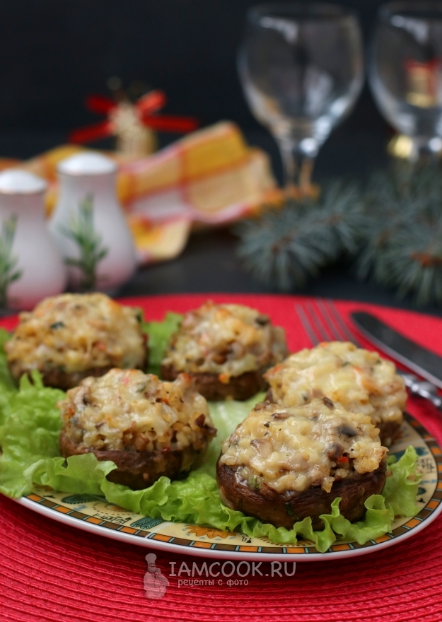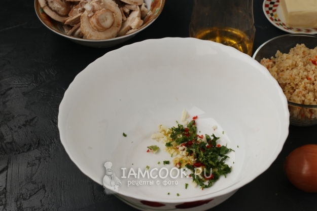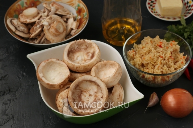 Ингредиенты для приготовления фаршированных булгуром шампиньонов возьмите по списку.