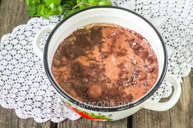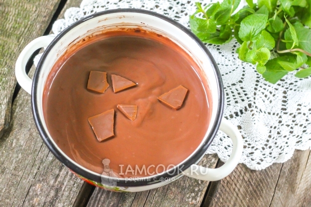 Помешивая, доведите напиток до необходимой вам густоты и выключите нагрев. Разломите плитку шоколада на кусочки и добавьте их в кастрюлю, тщательно размешайте.