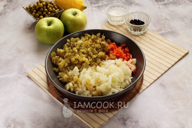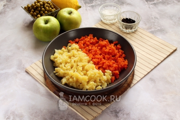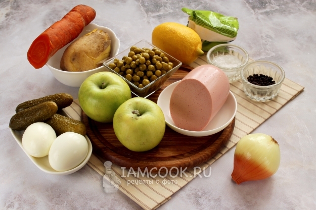 Чтобы приготовить классический салат «Оливье» с яблоком и колбасой, возьмите продукты по списку. Лучшие в этом салате яблоки — зеленых сортов, кисловатые и сочные. Заранее отварите картошку в мундире, неочищенную морковь и яйца вкрутую, остудите.