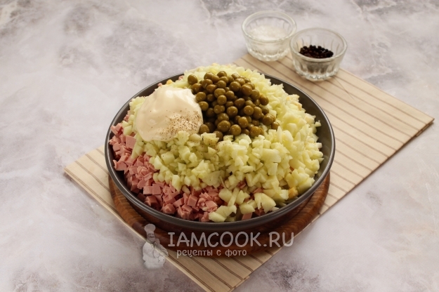 К нарезке прибавляем консервированный горошек (без рассола), майонез, по вкусу солим и перчим, перемешиваем.