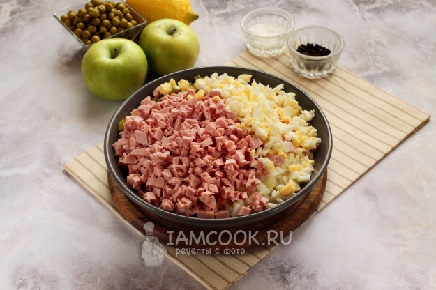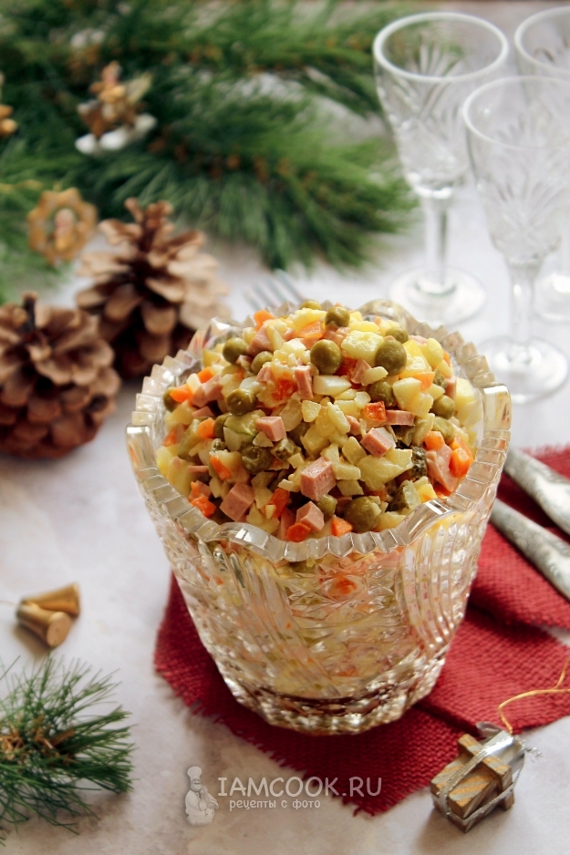Подаем салат «Оливье» с яблоком и колбасой к столу.