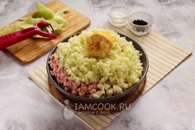 Снимаем кожуру с зеленых яблок, мякоть рубим — сразу сбрызгиваем лимонным соком, предохраняя от окисления/потемнения.