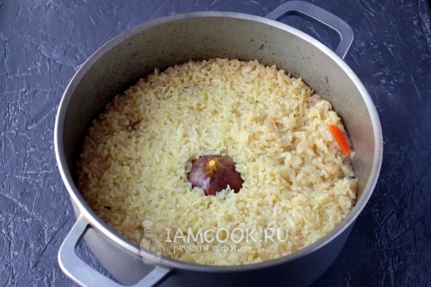 Готовьте плов до полного испарения жидкости, на это уйдёт около 30 минут.