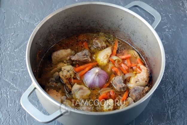 Влейте в казан горячую воду, так, чтобы она не только покрывала рис, но и была на 1,5 сантиметра выше его уровня. Если нужно, добавьте ещё немного соли. Накройте посудину крышкой и отправьте будущий плов с курицей в духовку, разогретую до 180 градусов.