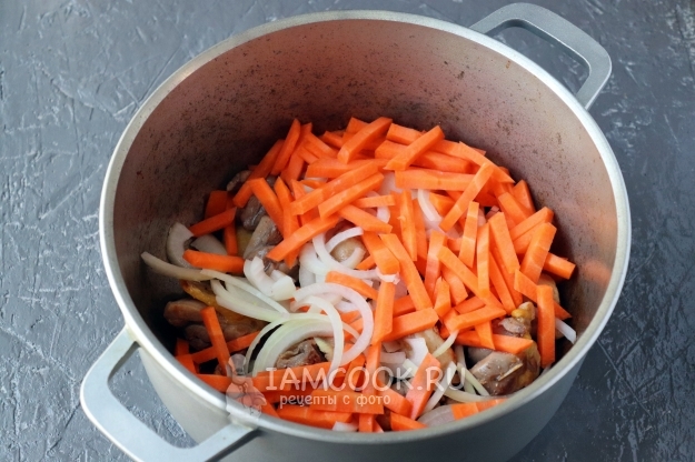 После того, как курица приобрела аппетитную корочку, выложите в казан измельчённые овощи. Лук нарежьте полукольцами, а морковь - соломкой. Всё вместе обжарьте в течение 5 минут, периодически помешивая. Помните, в плов добавляется много овощей, поэтому если они у вас небольших размеров, возьмите несколько луковиц и морковок.