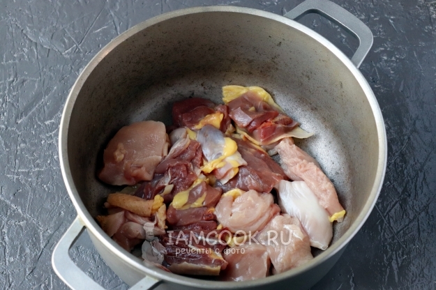 Куриное мясо вместе с кожей отделите от костей и нарежьте небольшими кубиками. Казан с растительным маслом хорошо разогрейте, чтобы появилось характерное шипение, и выложите мясо. Обжарьте его на сильном огне до золотистого цвета.