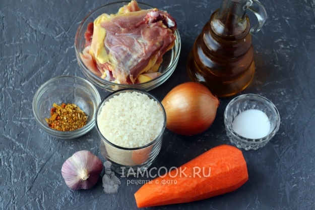 Для приготовления плова с курицей в духовке подготовьте продукты по списку к рецепту. Также очень важно подобрать подходящую посуду, которая выдерживает температуру духовки. Это может быть казан (как в моем случае), утятница, глиняный или керамический горшок, главное, чтобы с крышкой.
