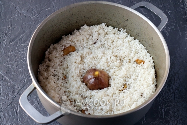 Влейте 1,5 стакана воды, а по центру поместите вымытую головку чеснока, очищать её при этом не нужно. Доведите жидкость до кипения, уменьшите огонь и томите в течение 20-30 минут, до мягкости мяса.