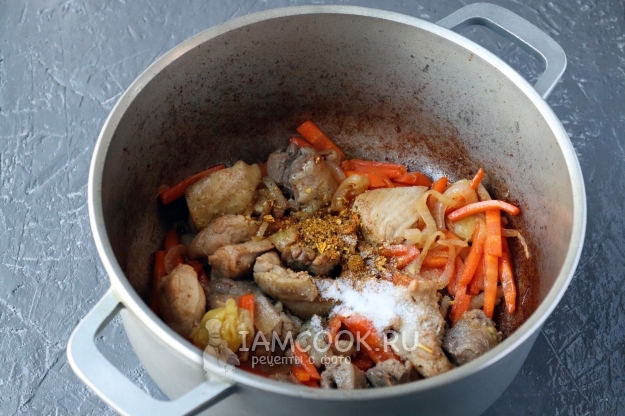 Содержимое казана посолите и посыпьте приправой для плова, немного прогрейте, чтобы специи смогли открыть все свои ароматы.