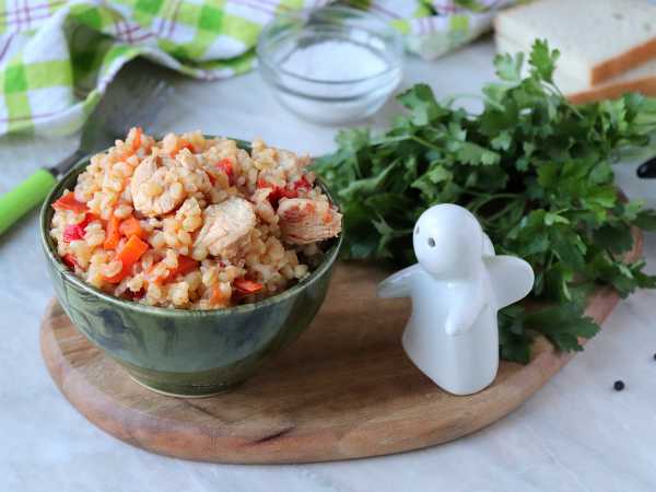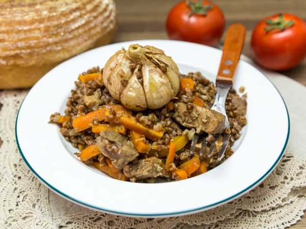 Всыпаем порцию булгура, опускаем несколько зубков чеснока. Не мешаем. Оставляем мясо и овощи снизу, крупу — сверху.