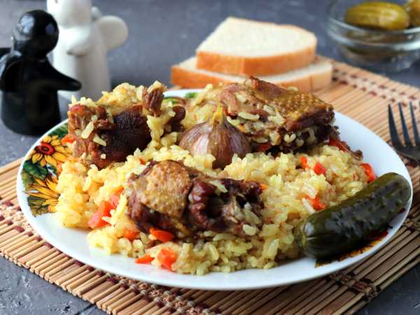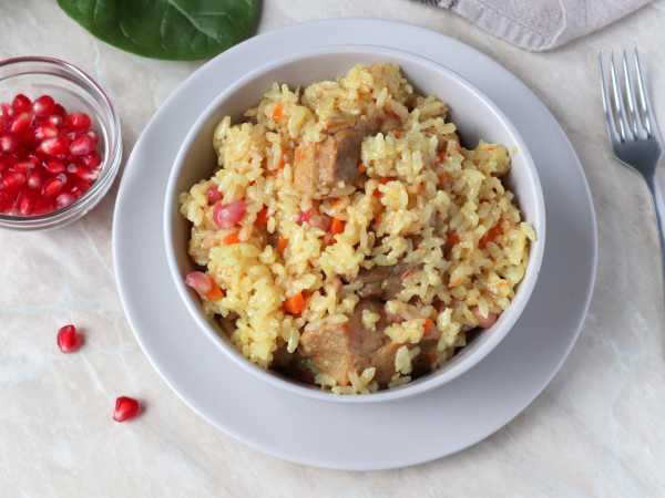 Горячий плов перемешиваем — поднимаем мясо с овощами со дна казана.