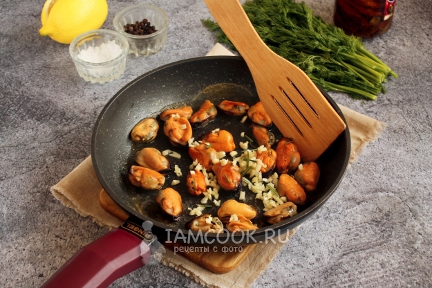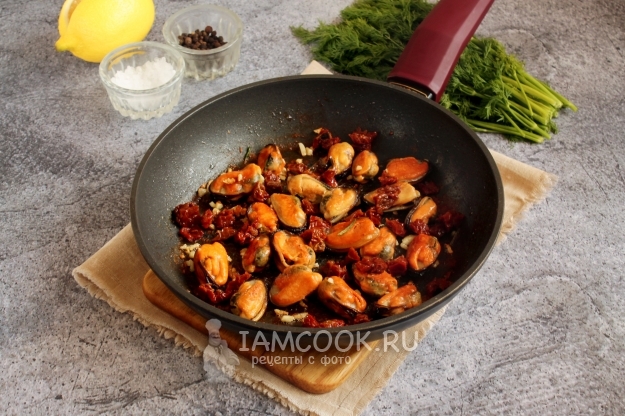К моментально оттаявшим мидиям вливаем ложку масла из банки с вялеными томатами, добавляем измельченный чеснок и иголки пряно-хвойного розмарина. Мешаем и обжариваем еще минуту-две.