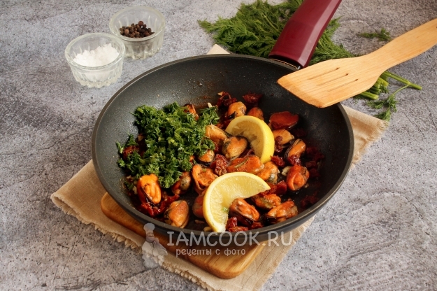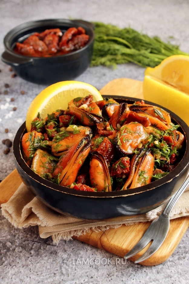 Подаем горячую закуску из мидий с вялеными томатами к столу.