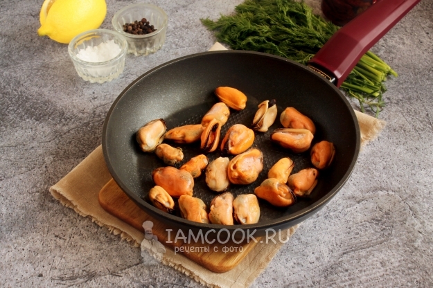 Очищенных заледенелых варено-мороженых мидий без оттаивания бросаем на раскаленную поверхность сковороды. Поддерживаем высокий огонь, даем сперва выделиться, а затем и полностью испариться влаге.