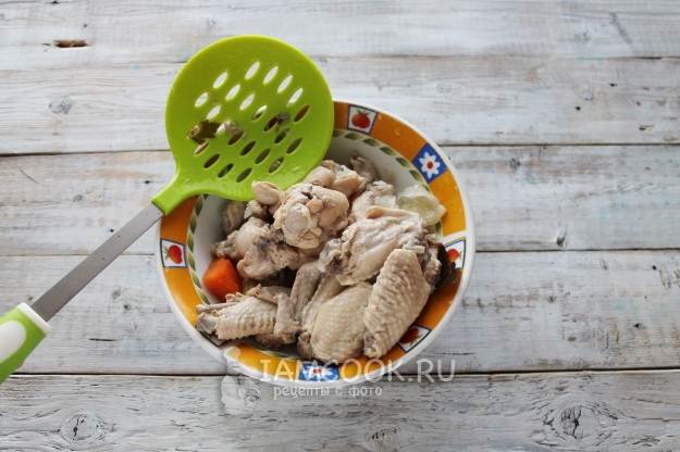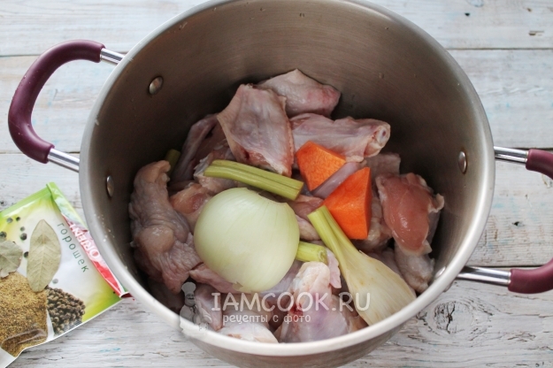 Крылья разрубите по суставам, сложите в кастрюлю, добавьте крупно нарезанные коренья, залейте водой и поставьте на огонь. Пряности можно добавить как сразу, так и за час до окончания варки.