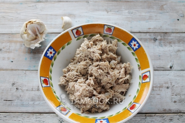 Измельчите мясо - я просто делаю это руками, надев перчатки. Добавьте измельченный чеснок.