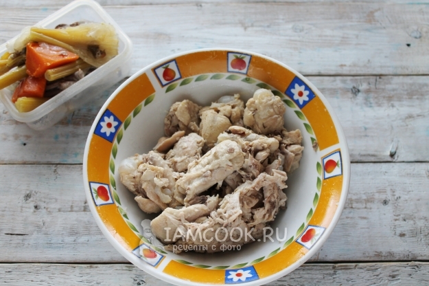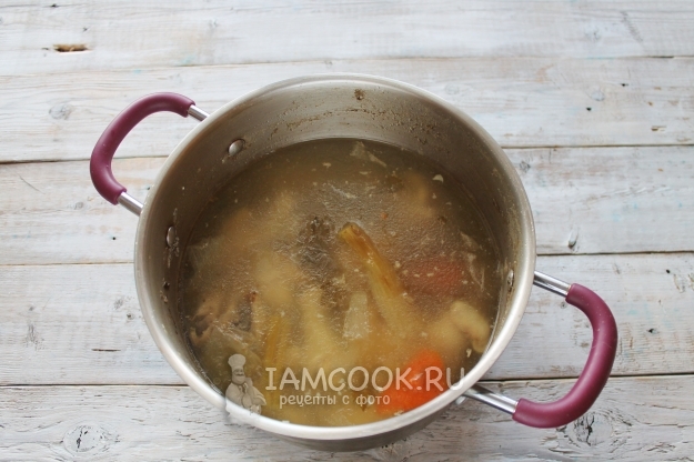 Варите 3 часа. В конце варки посолите по вкусу и добавьте желатин - приготовьте его как указано на упаковке. У меня уже обработанный, я просто добавляю ложку в бульон и довожу до кипения. Кстати, недавно читала об экспериментах по кипячению желатина - то, что раствор с желатином не застывает после длительного кипячения, оказалось мифом.