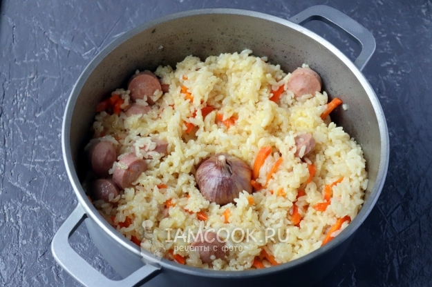 Выключим огонь и дадим блюду немного настояться. Через 15-20 минут плов с сосисками можно перемешать и подавать на стол.