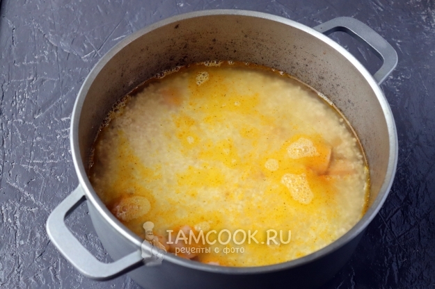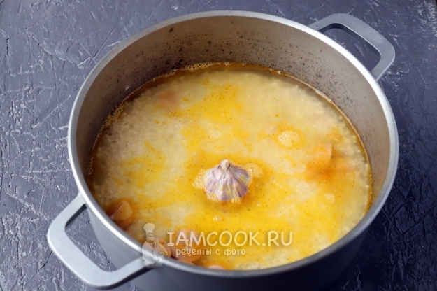 В центре вставляем головку чеснока, помытую, но не очищенную. Доводим жидкость до повторного кипения, накрываем казан крышкой и томим 25-30 минут на медленном огне.