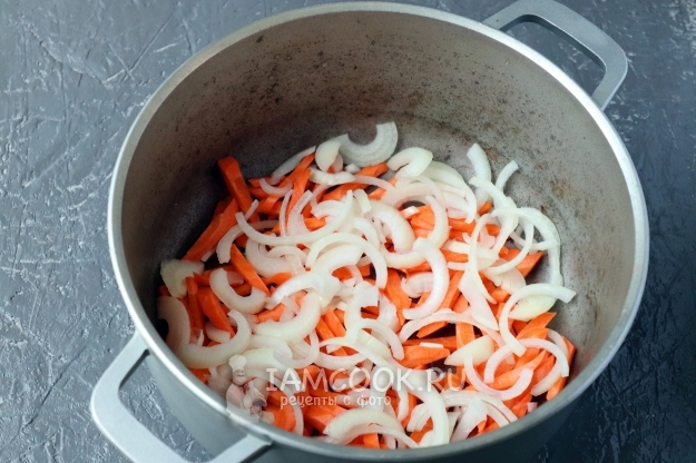Очистим и измельчим овощи. Лук нарежем полукольцами, а морковь - длинными брусочками. Казан (сковороду или толстодонную кастрюлю) хорошо разогреем, нальем растительного масла и выложим овощную нарезку. Помешивая, будем жарить 5 минут.